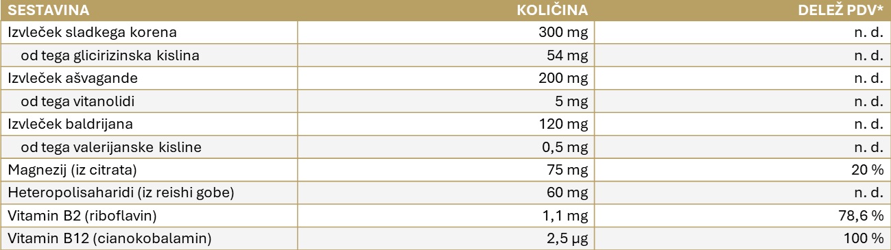 Kokosovo (Cocos nucifera) mleko, magnezijeve soli citronske kisline, koncentrat rdeče pese (Beta vulgaris), izvleček sladkega korena (Glycyrrhiza glabra) standardiziran na najmanj 18 % glicirizinske kisline, heteropolisaharidi iz reishi (Ganoderma lucidum) gobe, izvleček ašvagande (Withania somnifera) standardiziran na najmanj 2,5% vitanolidov, naravna aroma, sladila (ksilitol, sukraloza), izvleček korenine baldrijana (Valeriana officinalis) standardiziran na 0,42 % valerijanske kisline, riboflavin (vitamin B2), cianokobalamin (vitamin B12).